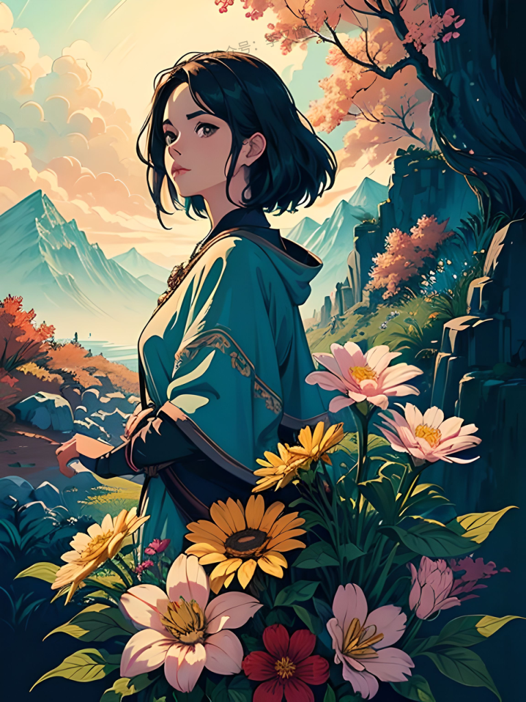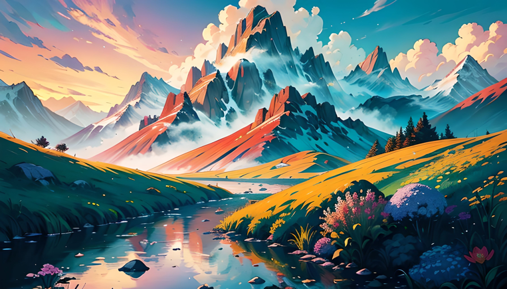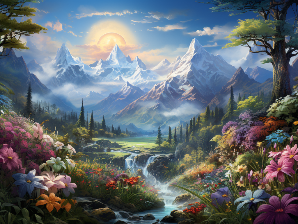 【提示词】a painting of mountains with flowers in it, in the style of mystical realms, disney animation, realistic depiction of light, vibrant illustrations, d&d, thechamba, high-keyed palette –ar 4:3 –s 250 –v 5.2
