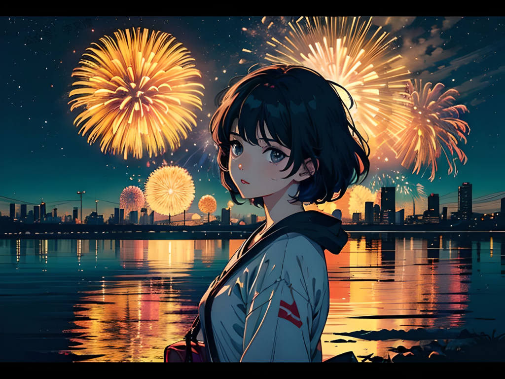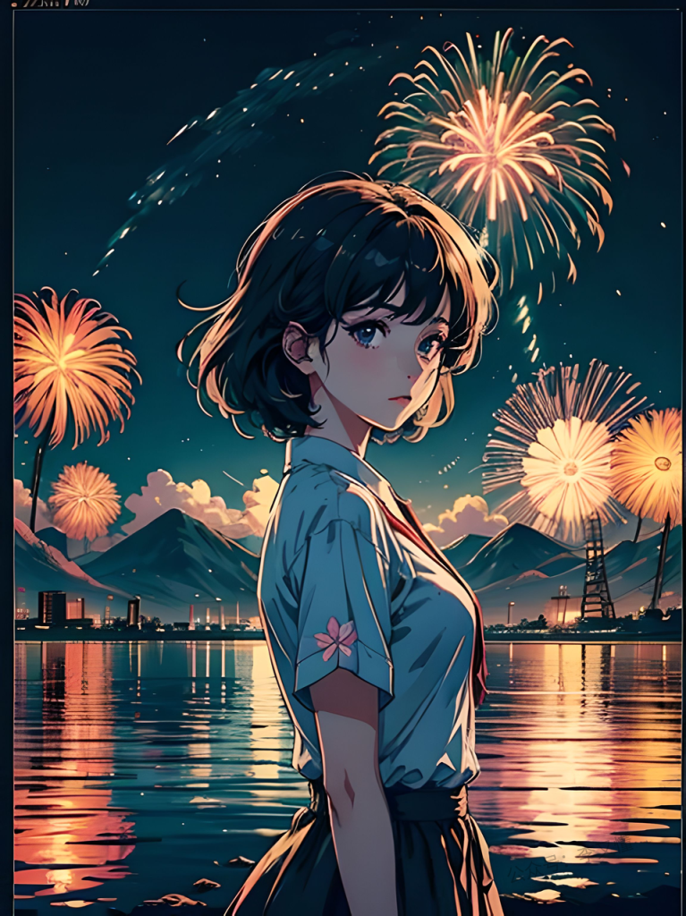 【提示词】vaporwave, showa comic, a girl’s,reflected a magnificent firework blooming, summer night