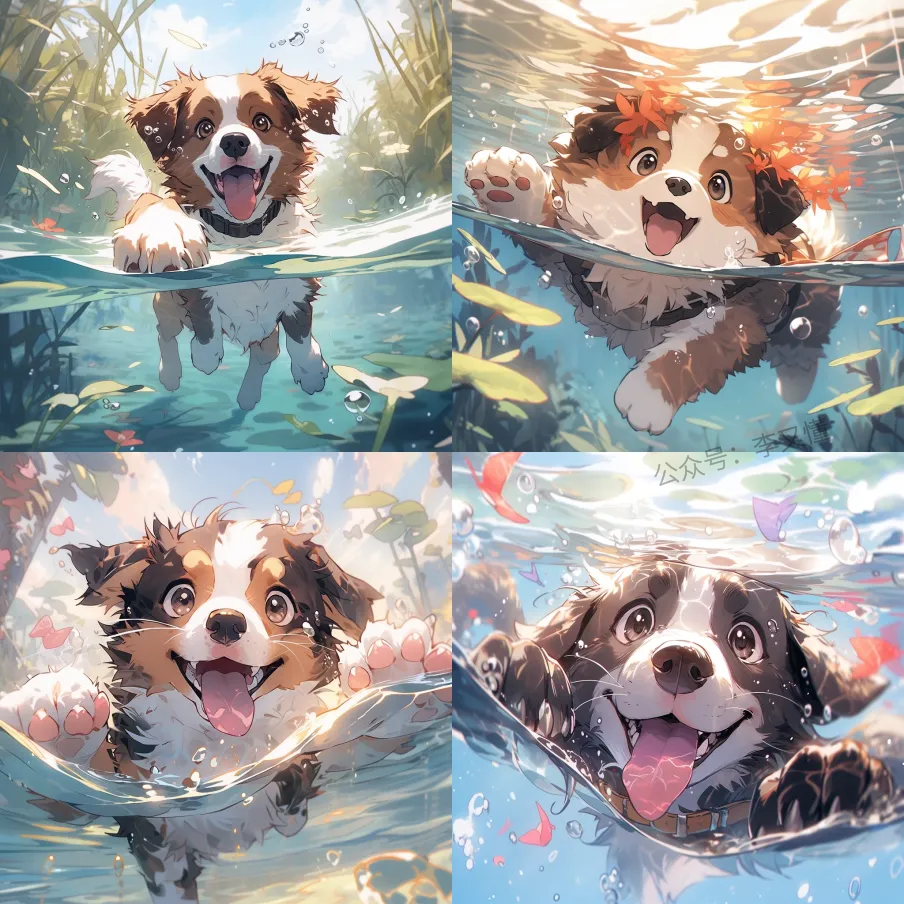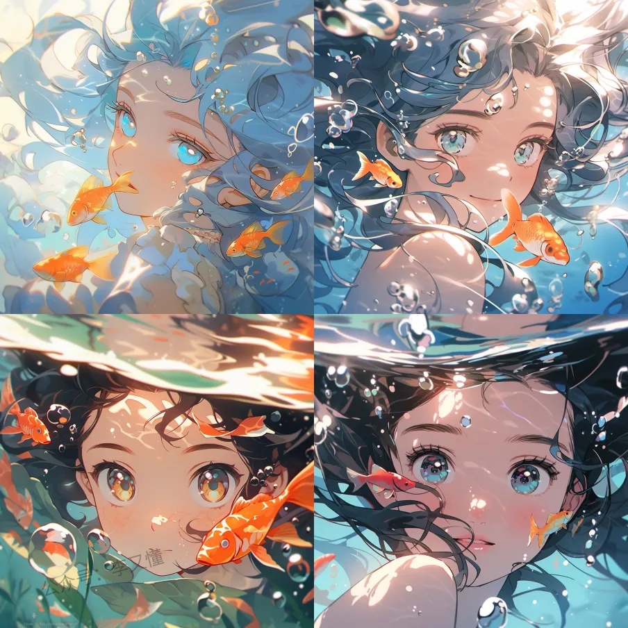 直接上prompt:a cute boyswimming underwater,bright eyes,protrait,happy, fantasy,Bright colors –q 2 –s 250 –niji 5