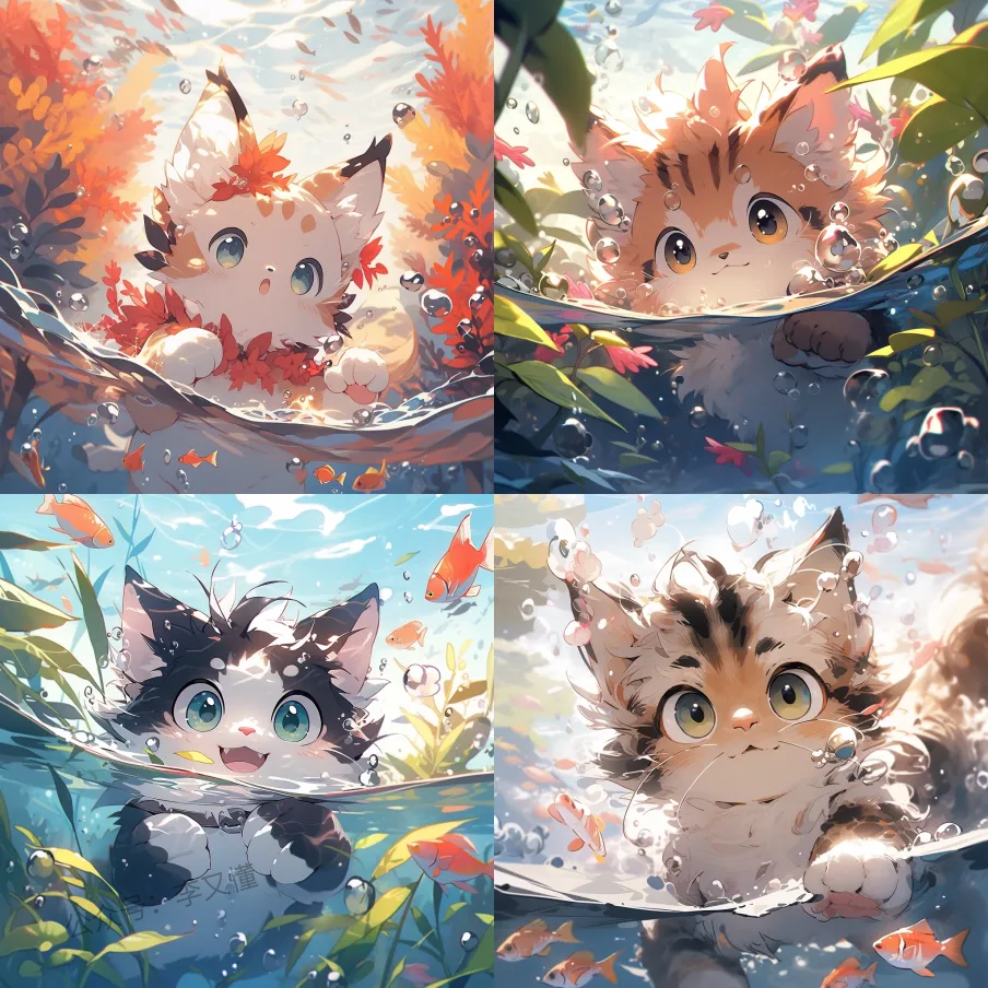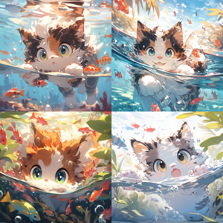 a cute cat swimming underwater,bright eyes,protrait,happy, fantasy,Bright colors –q 2 –s 250 –niji 5