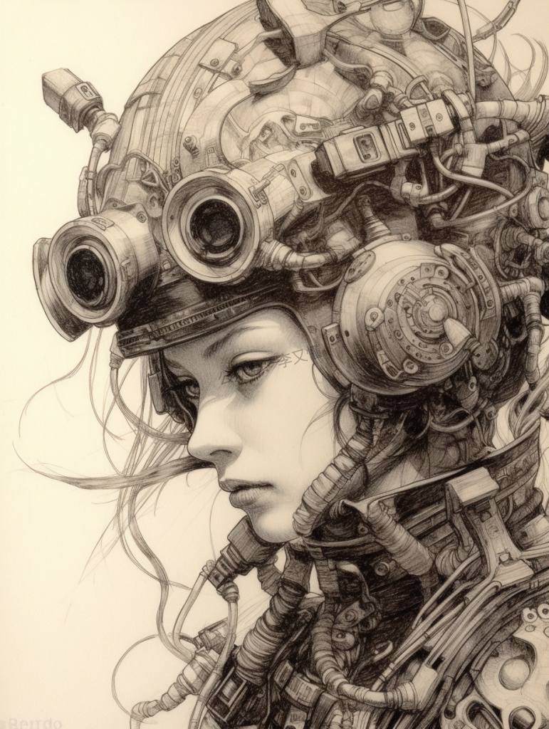 inkpainting sketch of a robotic Bea,intricate steampunk, dieselpunk, heavy inking, hyper-realistic detail, by Ohara Koson –ar 3:4 –q 2 –s 250