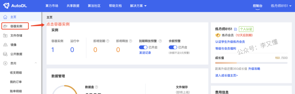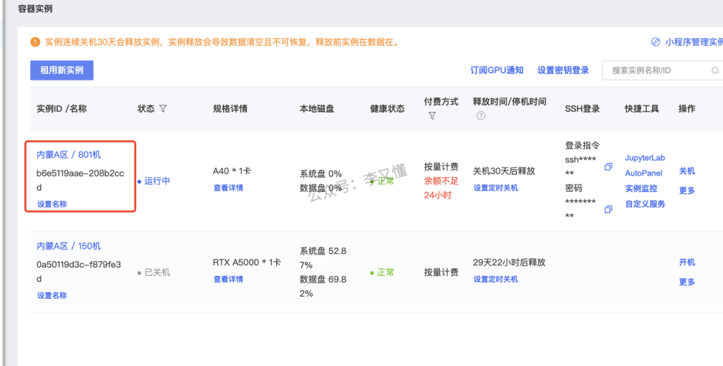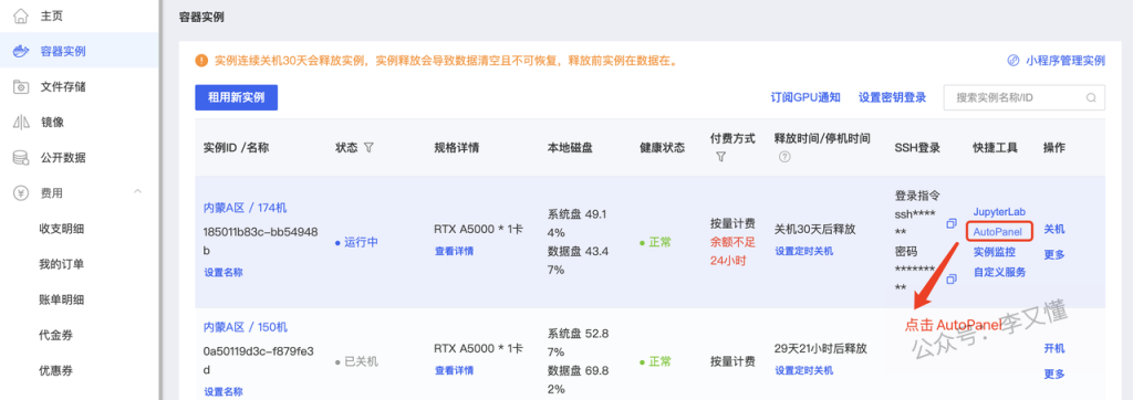 首先,我们先回到容器列表 https://www.autodl.com/console/instance/list,然后点击AutoPanel