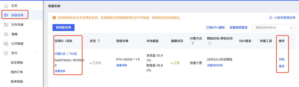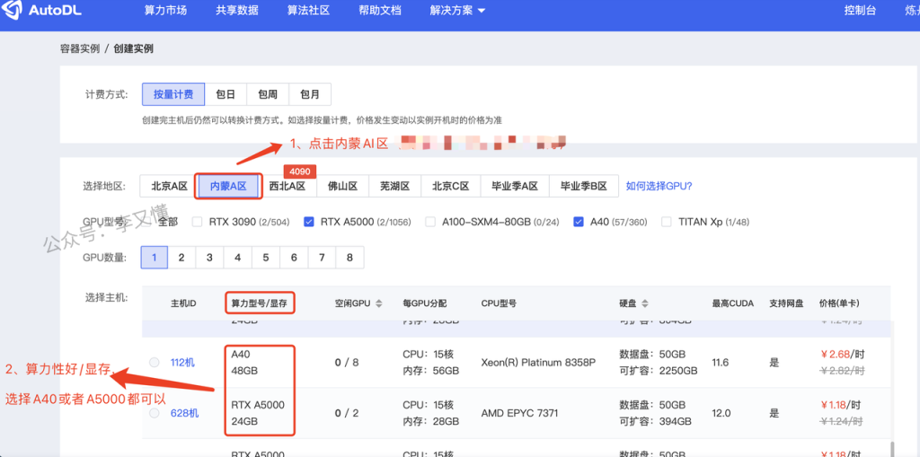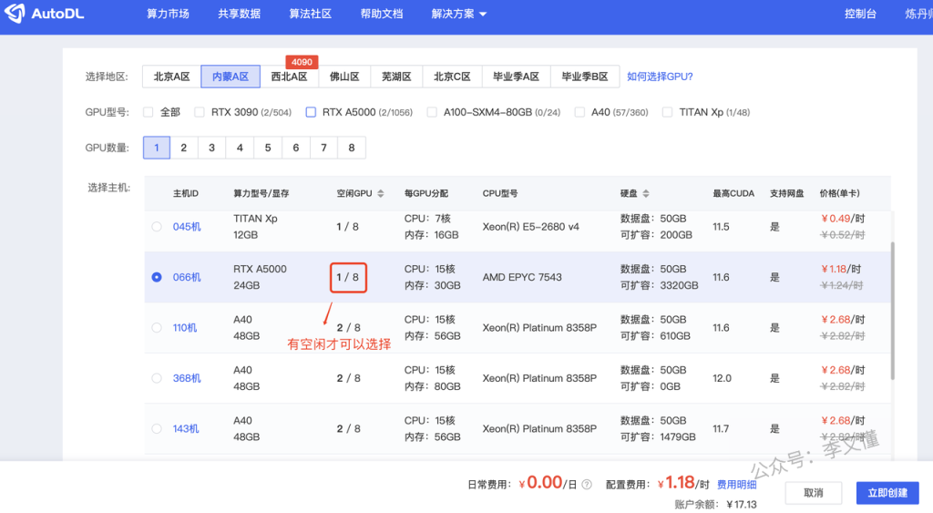 此处,我们选择A5000算力型号,在这里要注意的一点是,要有空闲GPU才可以选择,如果没有的话是选不了的