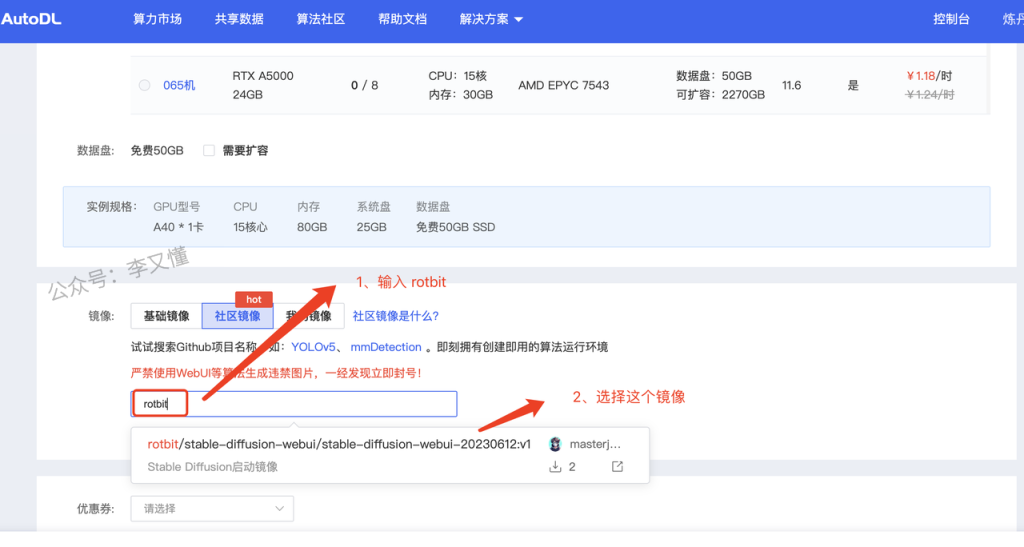 选定了A5000之后,点击右下角的立即创建,就会自动跳转到一下的页面,然后我们需要点击社区镜像