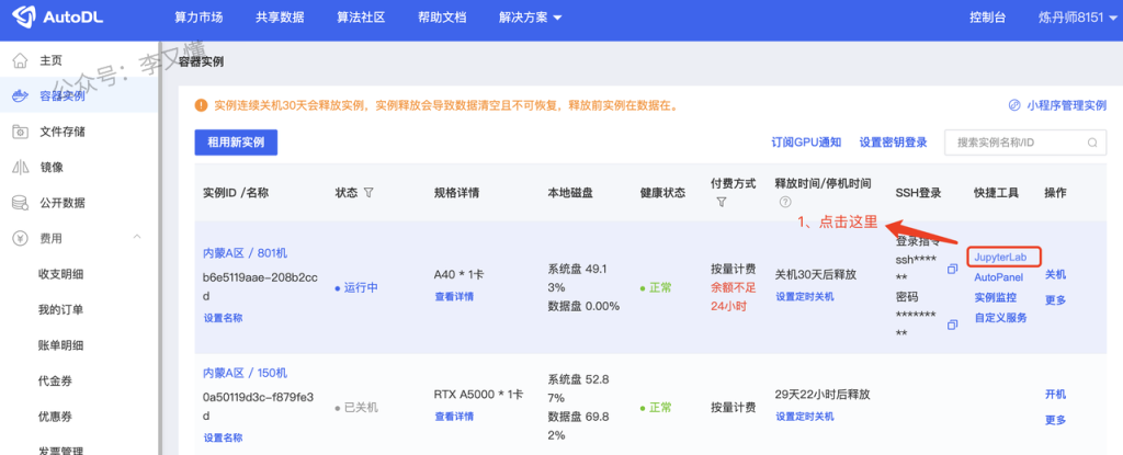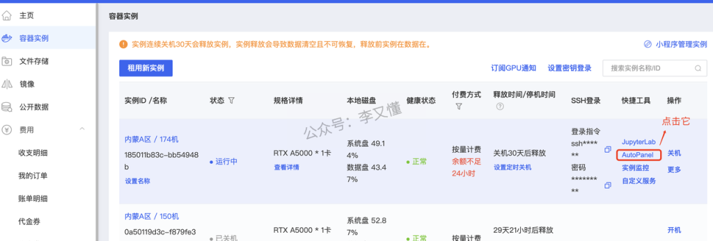 第一步,我们回到实例列表https://www.autodl.com/console/instance/list,点击AutoPanel