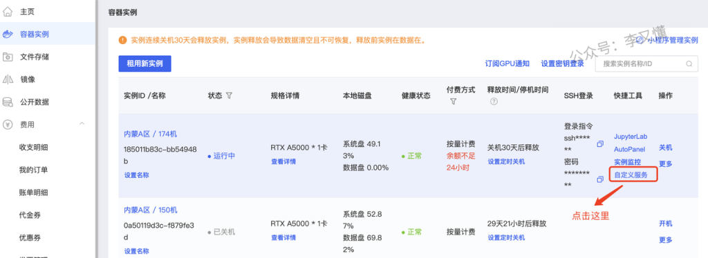 然后我们再回到容器列表中 https://www.autodl.com/console/instance/list,点击「自定义服务」,如下图所示