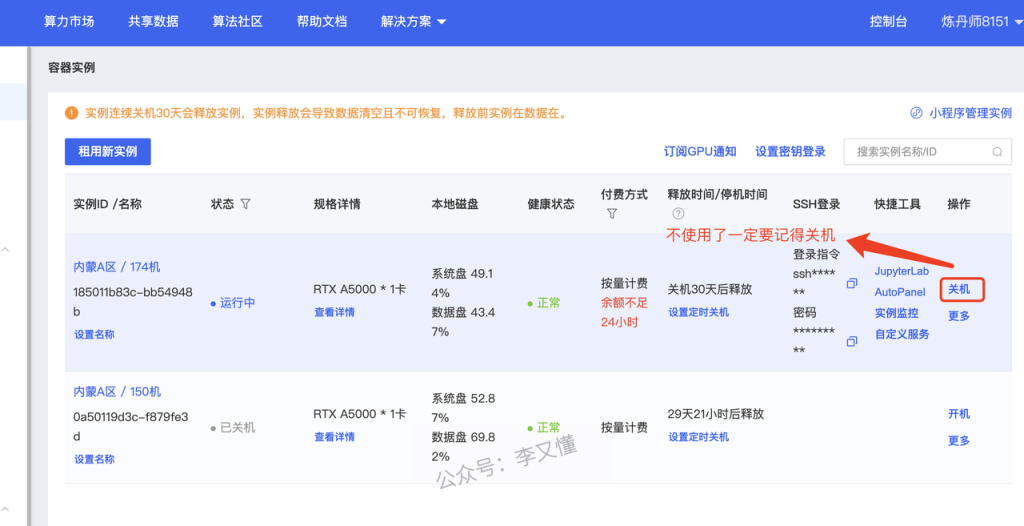 有一点要注意,如果不使用了,一定要记得关机,需要使用下次再打开,实例开着会消耗我们的余额