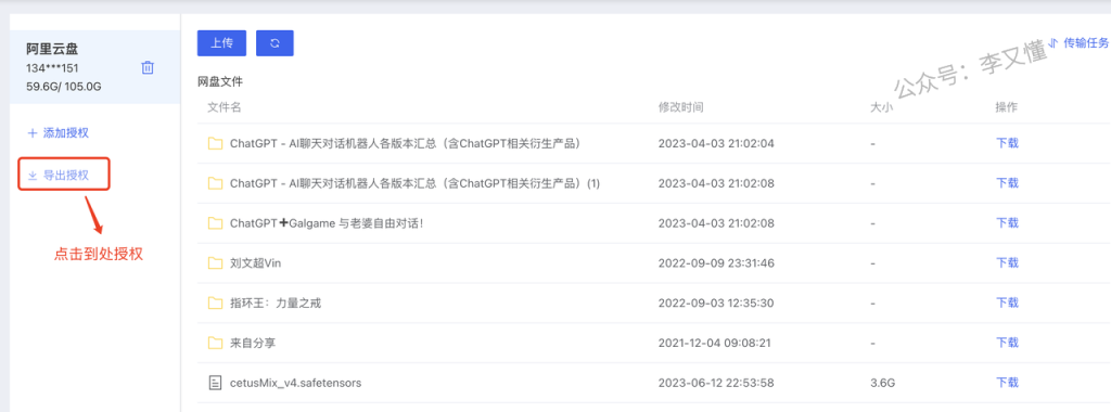 第三步、在完成授权后,我们是可以看到右侧已经有了阿里云盘的信息了。然后我们点击导出授权