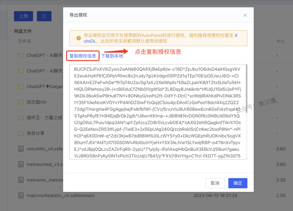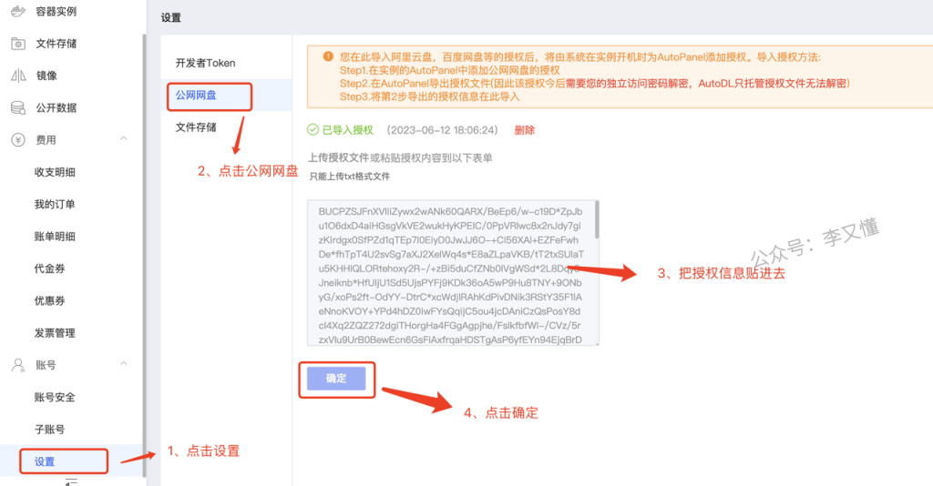 最后,我们在此回到实例列表,点击设置,然后点击公网网盘,将授权信息贴进去,如下图所示