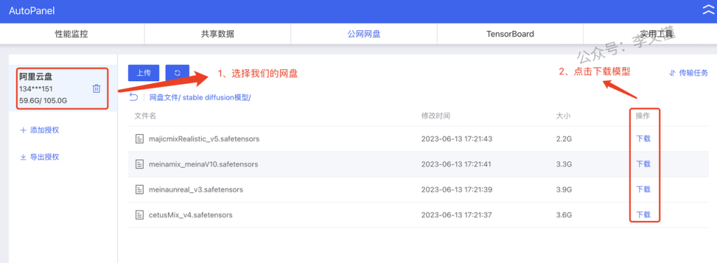 但在这里,我们要介绍的不是这一种方式。我们租用的机器可以用的存储空间才50G,放不了太多的模型,