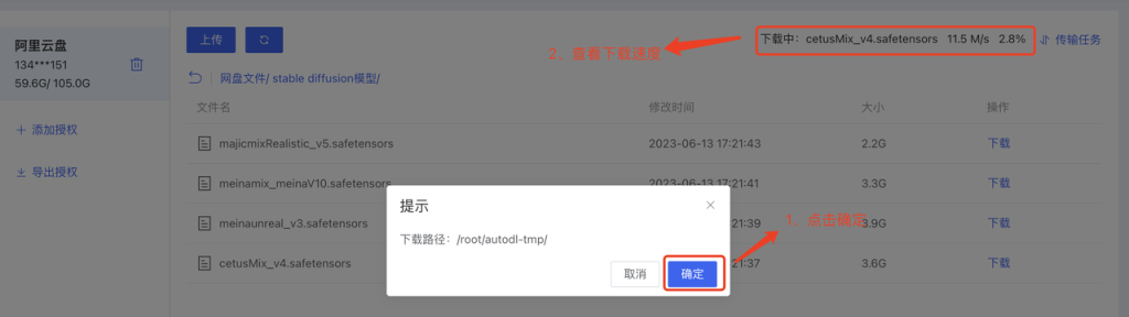 我们的模型在哪里下载呢?一般我会在 https://civitai.com/(需要特殊网络设置才可以访问)下载,下载完成后,直接上传到和AutoDL关联的阿里云盘就可以了。一般上传到阿里云盘是非常快的,不到1分钟就可以了。