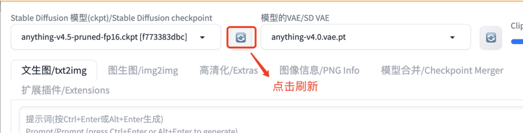 移动之后,再回到我们的Stable Diffusion Web界面,我们点击模型下拉框的刷新按钮