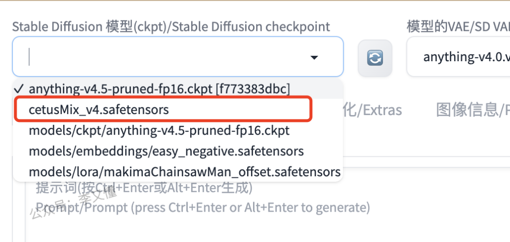 然后在此点击下拉框,就可以看到我们新增加的模型了,注意“models/xxx”开头的不是我们的模型,不要选他们