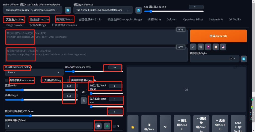 通过以下这个截图,我将逐一为大家介绍SD界面中最常用的功能。