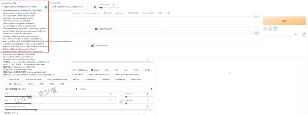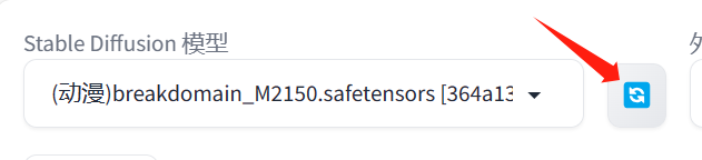 接着我们回到SD,点击旁边这个刷新按钮,这样新安装的大模型就会自动加载上来,我们就可以直接选用了