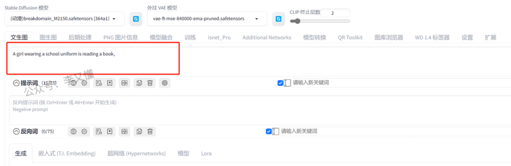 - 正向提示词:描述你希望图片中出现的元素。(例如:“一个女孩”)