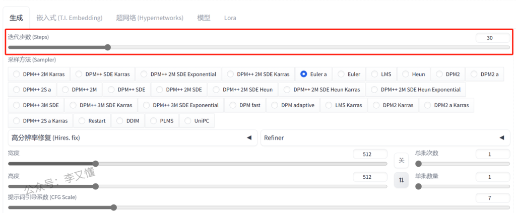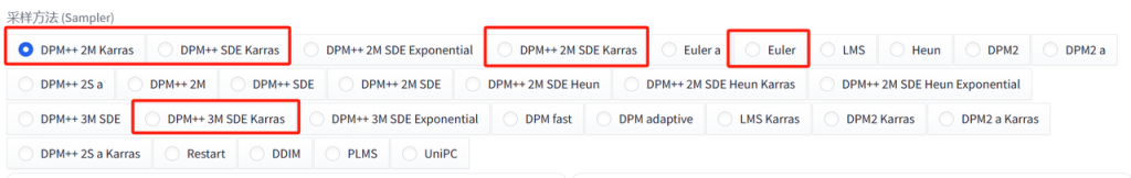 - 采样器:指AI绘画时所采用的不同算法。日常使用中,我们常用四五种,推荐使用带+号的几种。