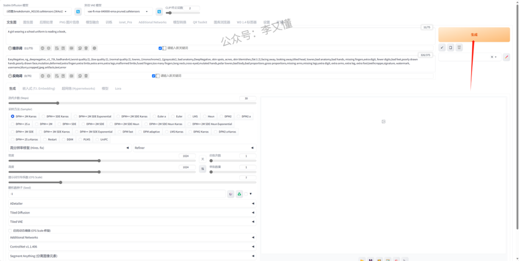我们作为魔法师开心的学习了咒语,复制到自己的SD中,同时选择了相同的大模型,但是跑出的图片仍然有很多细节方面不同,大概率就是用了不同的Lora。