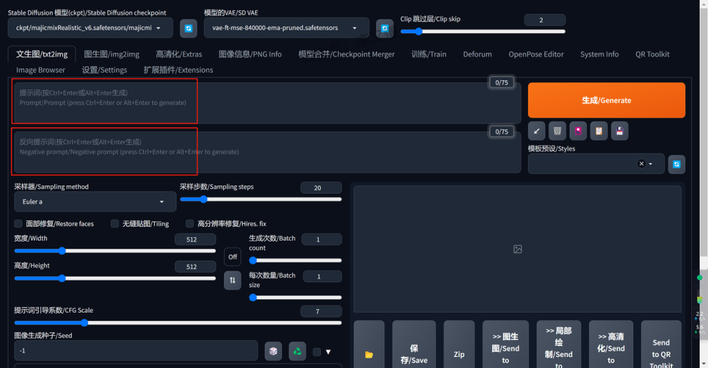 需要注意的是:SD目前只能看懂英文,英文好的小伙伴可以直接在提示词部分输入英文,英文不好的小伙伴也不要担心,直接用翻译器翻译一下就好了。