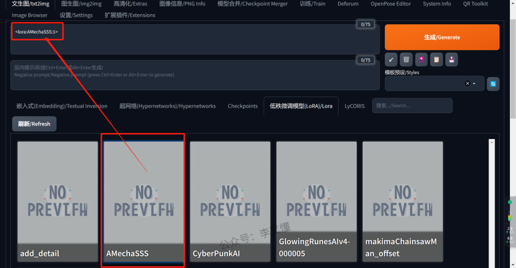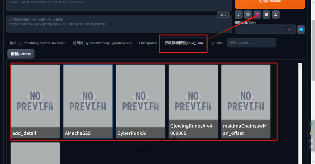 当你点击生成按钮下方的红色图标,就会出现上图中的内容,红框里的就是微调模型Lora。