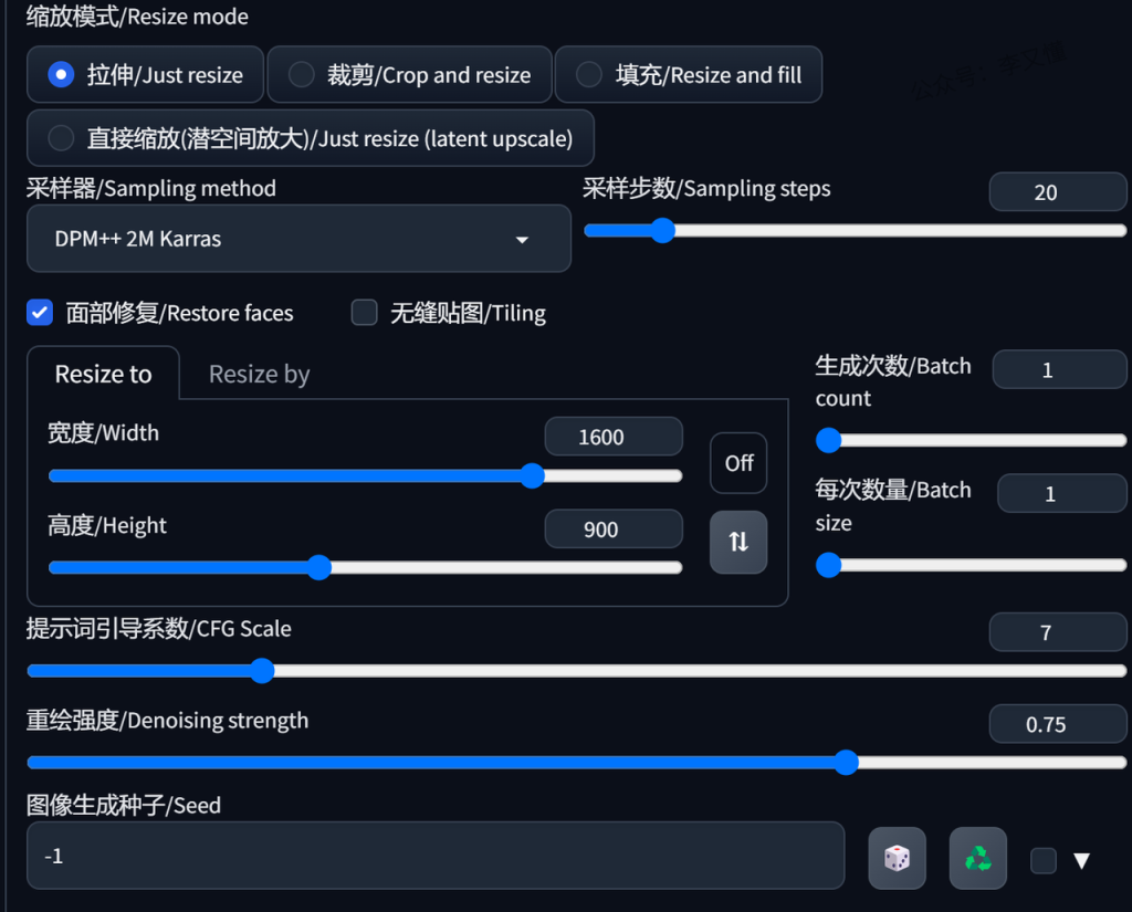 - 随机种子:点击骰子图标,表示随机生成图片。点击绿色循环箭头,则依据上一张生成的图片为基础继续创作。