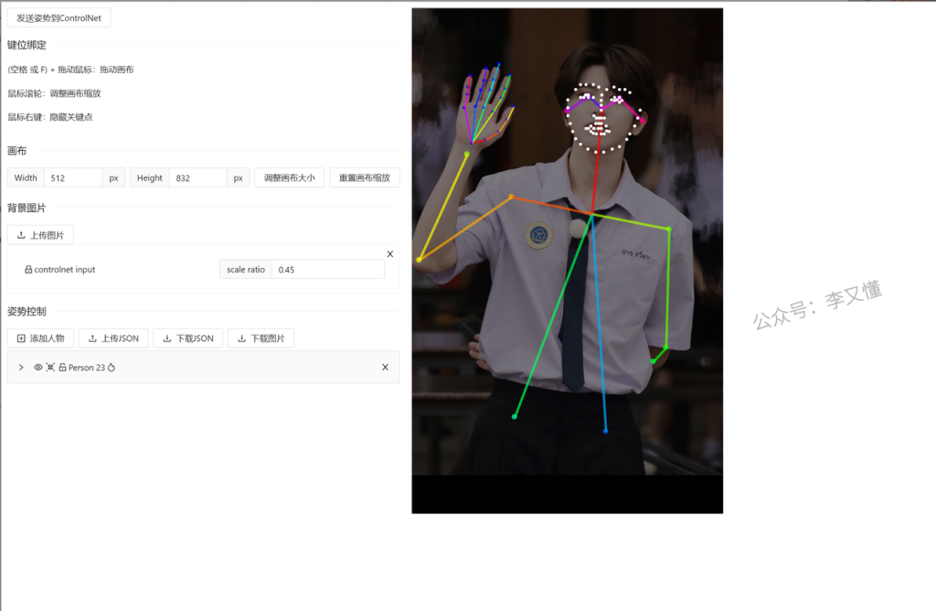 点击预处理的爆炸按钮就可以看到,模特的姿势被提取成了一个火柴人