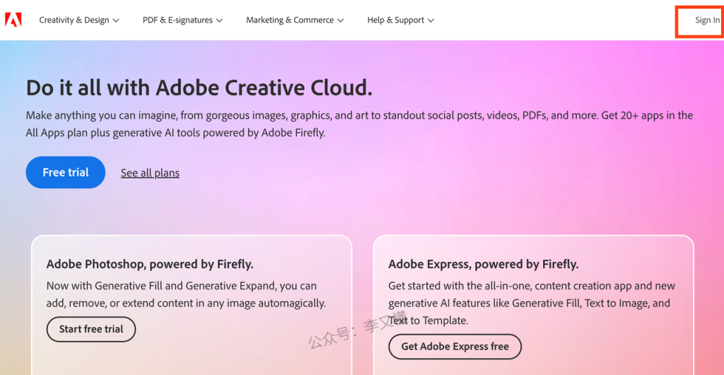 进入官网 https://www.adobe.com/ ,点击右上角“Sign In”