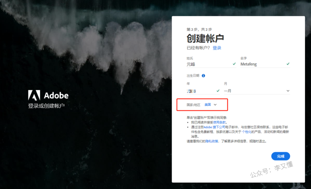 国家/地区一定要选「美国」!出生日期确保年龄 > 18岁