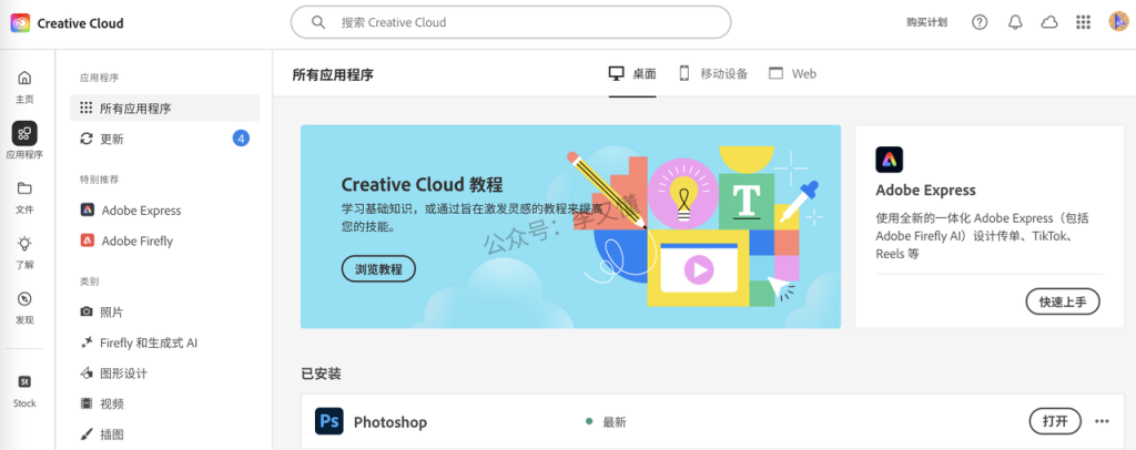如果是从网盘下载安装的Photoshop,在登录 CreativeCloud 后,可以看到你已经安装的软件,但不要直接从CreativeCloud下载或更新软件!