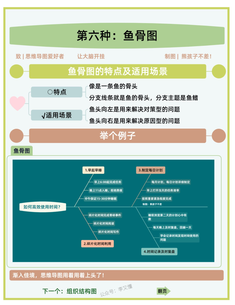 特点:像是一条鱼的骨头,分支线条是鱼的骨头,分支主题是鱼鳍。