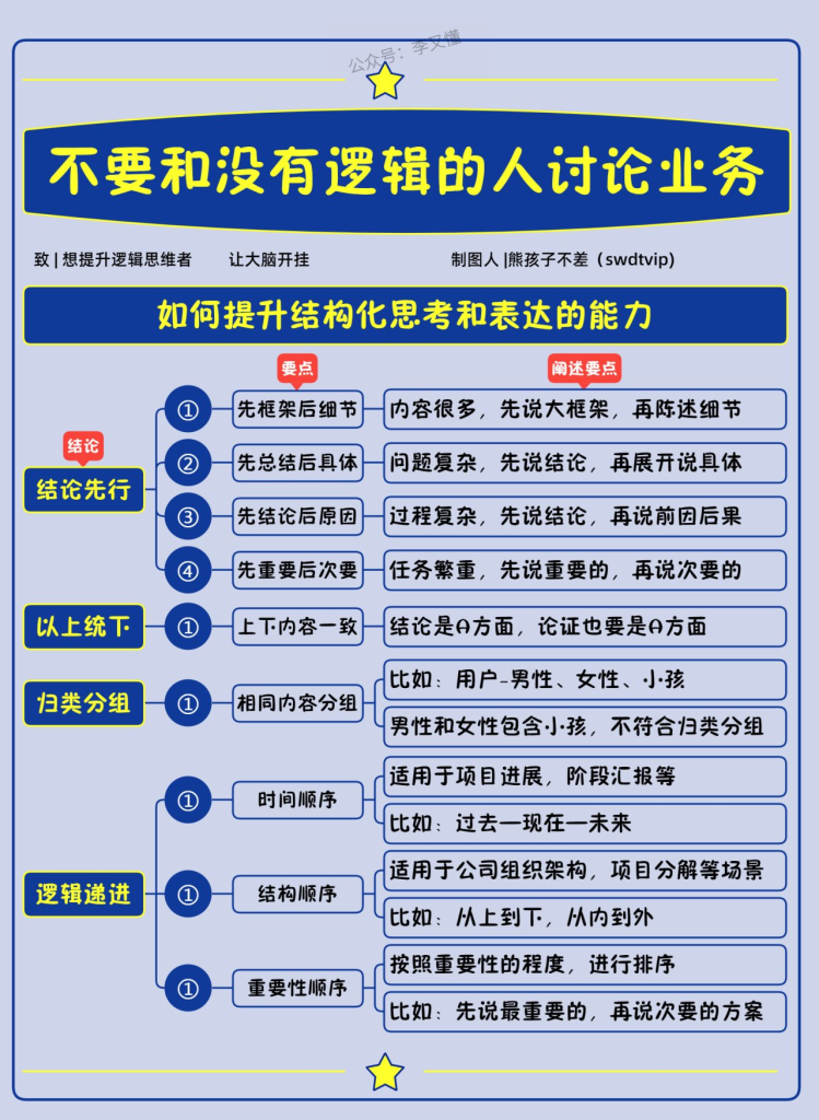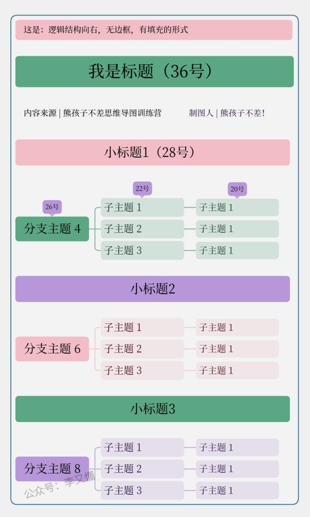 应用案例 我们在做竖屏思维导图的时候几乎 80% 的场景都适合用逻辑图结构做竖屏思维导图,属于我们最常用的方法。 这里我给大家展示几个案例哈: 样版展示: 实操演示 逻辑图做竖屏思维导图可以参考咱们前面的视频和图文。 查看网盘资料课程:3.1.2 制作一个极简竖屏思维导图