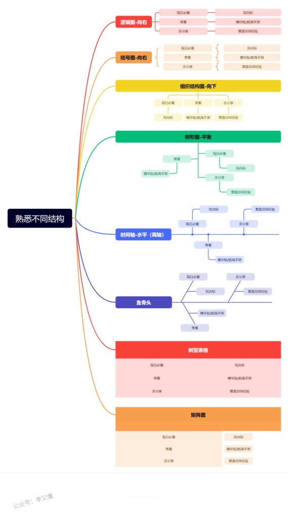我们还可以尝试多种结构自由组合,像下图这样。 具体如何操作的呢?可以看下面的视频: 00: 55 创建自由主题 01:31 标题 信息栏 01:39 逻辑图-向右 03:18 括号图-向右 03:44 组织结构图-向下 04:36 树形图-平衡 05:10 时间轴-水平(离轴) 06:01 鱼骨图 06:27 树形表格 06:50 矩阵图 07:35 金句 07:50 导图宽度调整 见资料:3.5 进阶思维导图结构——自由组合