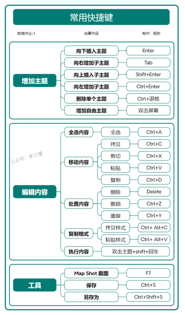要想提升导图设计速度,快捷键的使用很重要。老师把所有的常用快捷键,做成了一张思维导图。
